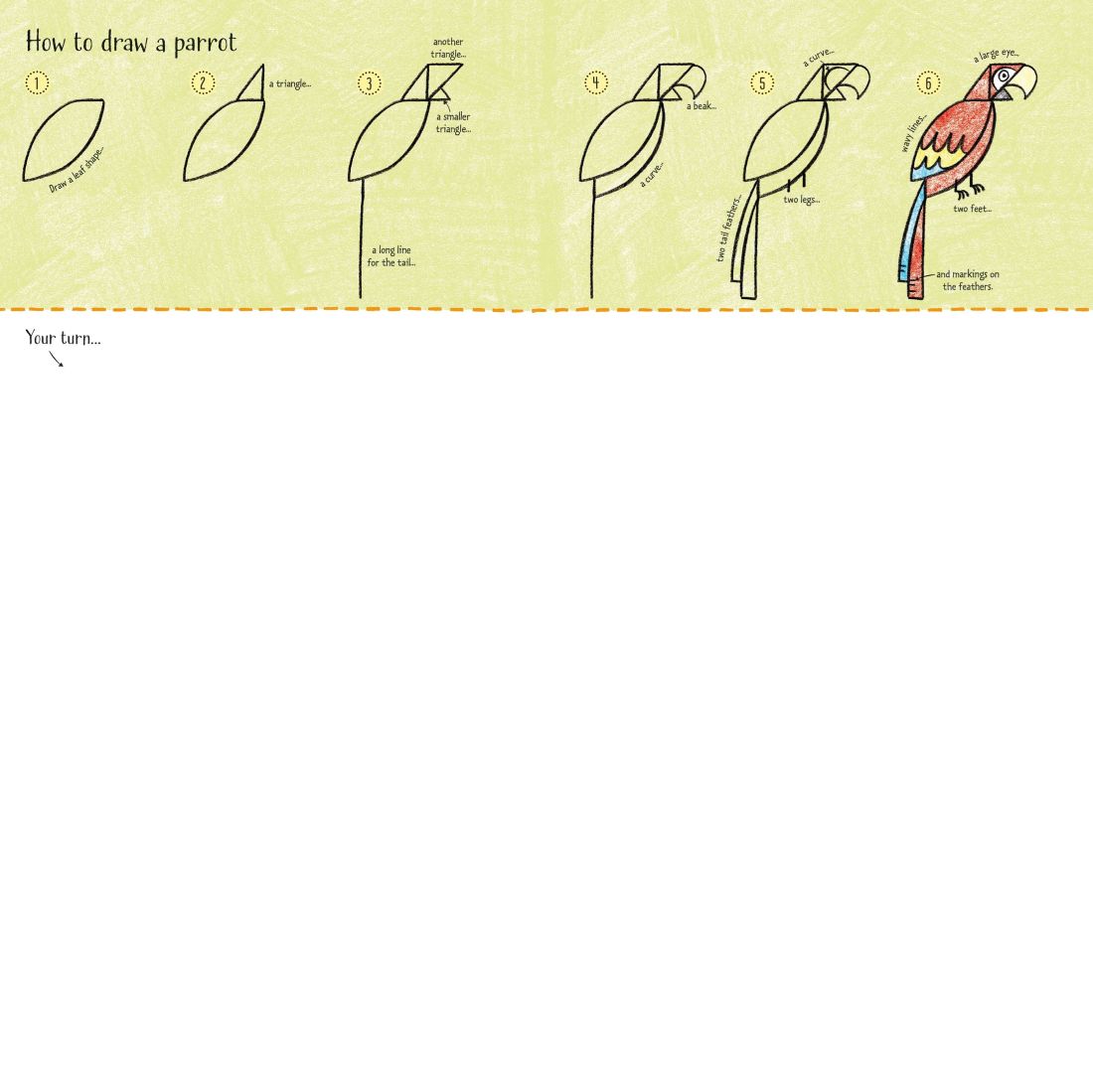 בכל עמוד כפול יש הוראות ציור שלב אחר שלב, הרבה מקום לתרגל ולשרבט בו, ורעיונות מקוריים לצביעה או הוספת רקע וקישוטים.