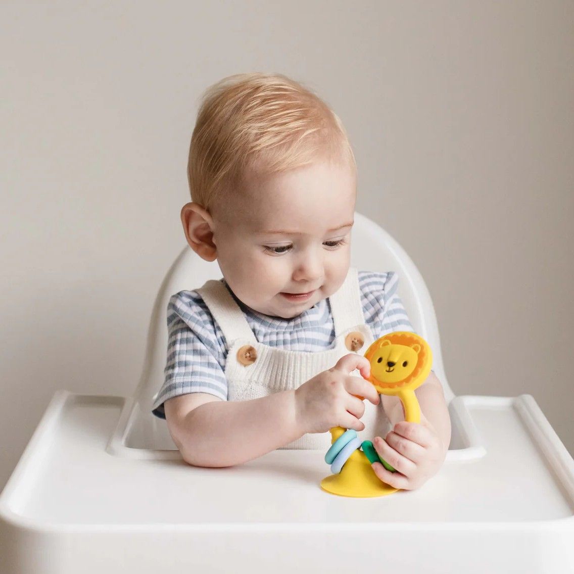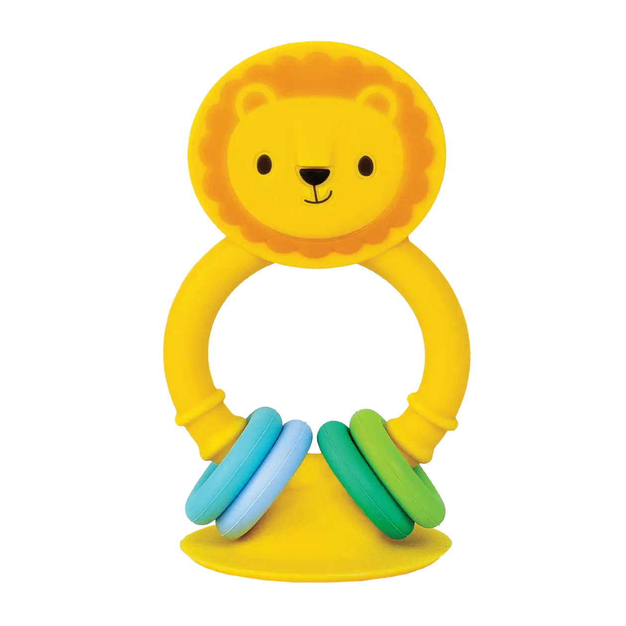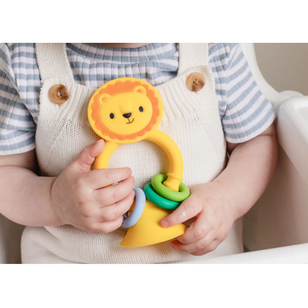 עם בסיס וואקום, האריה נצמד למשטחים חלקים וחוזר למצב זקוף בכל פעם שהתינוק מושך או דוחף אותו.