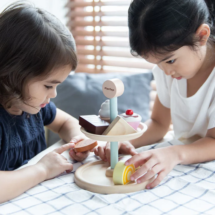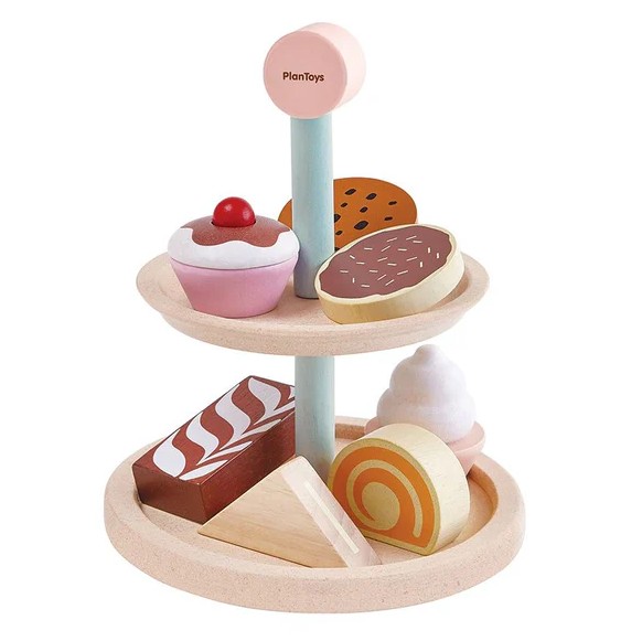 הערכה מכילה מעמד דו-קומותי של עוגות, כריך, רולדה, עוגת שוקולד, 2 ביסקוויטים ו- 2 קאפקייקס.