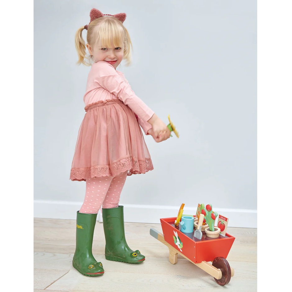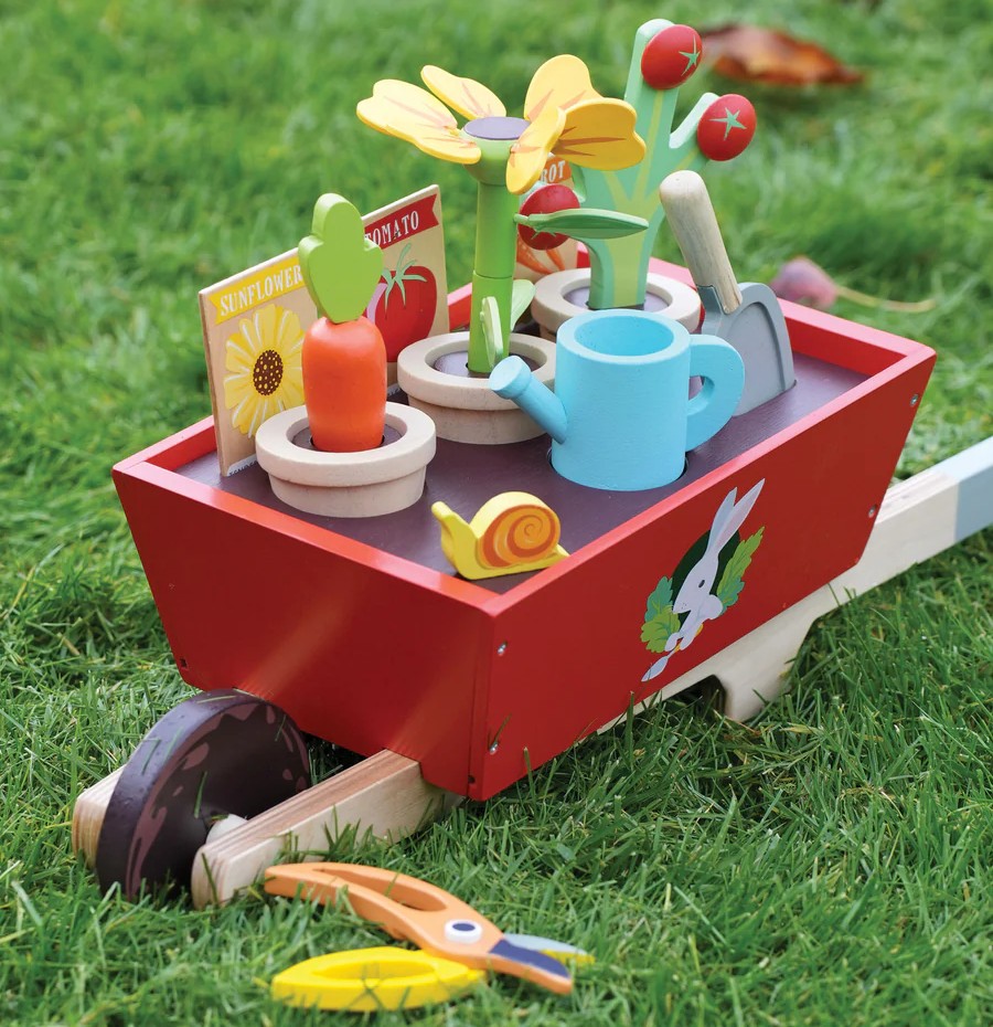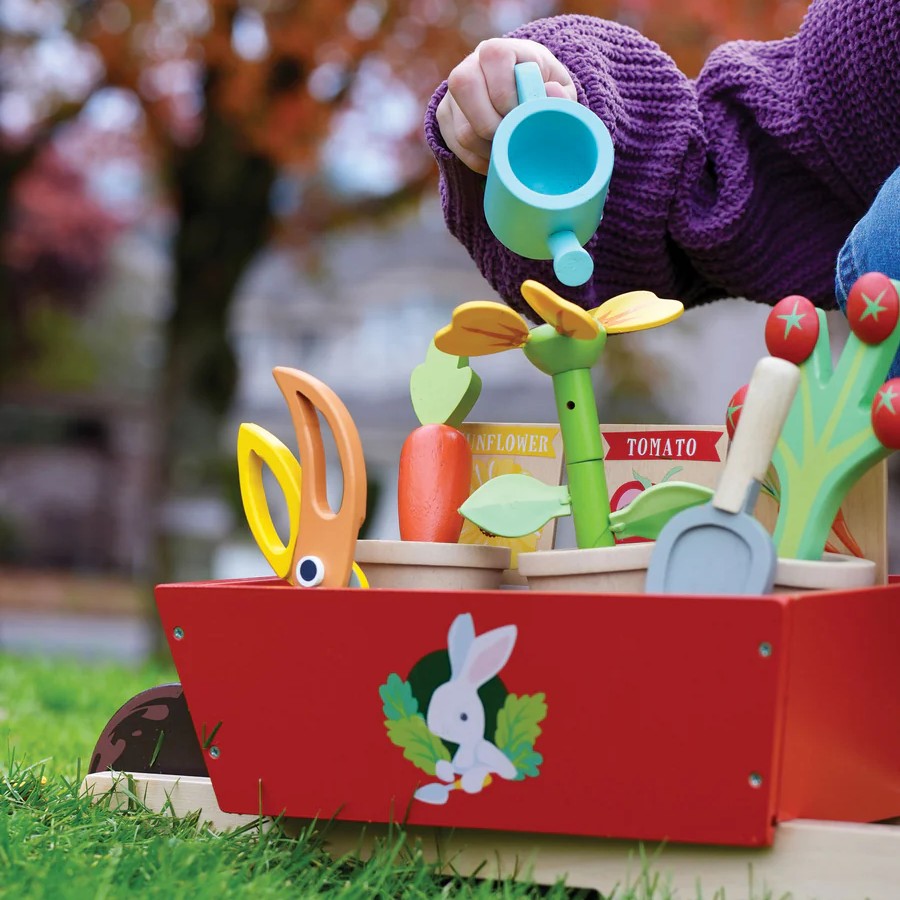 סט "גינה" הכולל מריצה יציבה מעץ מלא, עם 3 חבילות זרעים, 3 עציצים עם צמחי חמניות, גזר ועגבניות, משפך, כף ומזמרה.