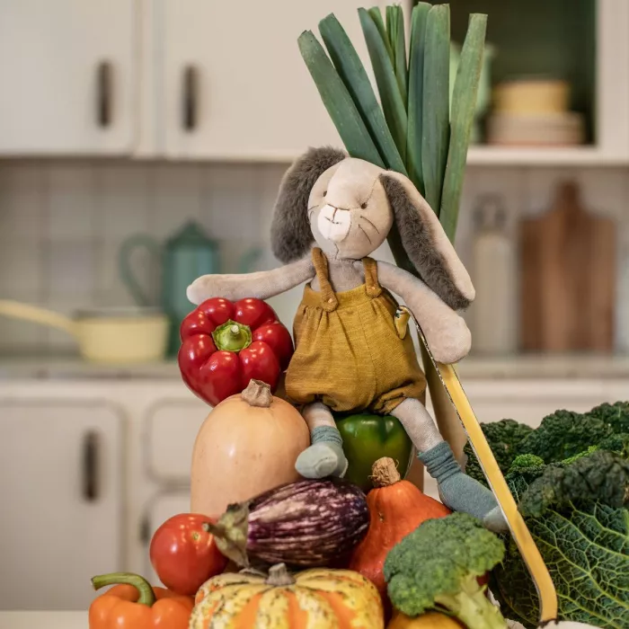 בובת ארנבון קטיפתי, לבוש באוברול עשוי ג'רזי, עם פומפון בקצה הכובע, אוזניים גדולות ורגליים ארוכות.