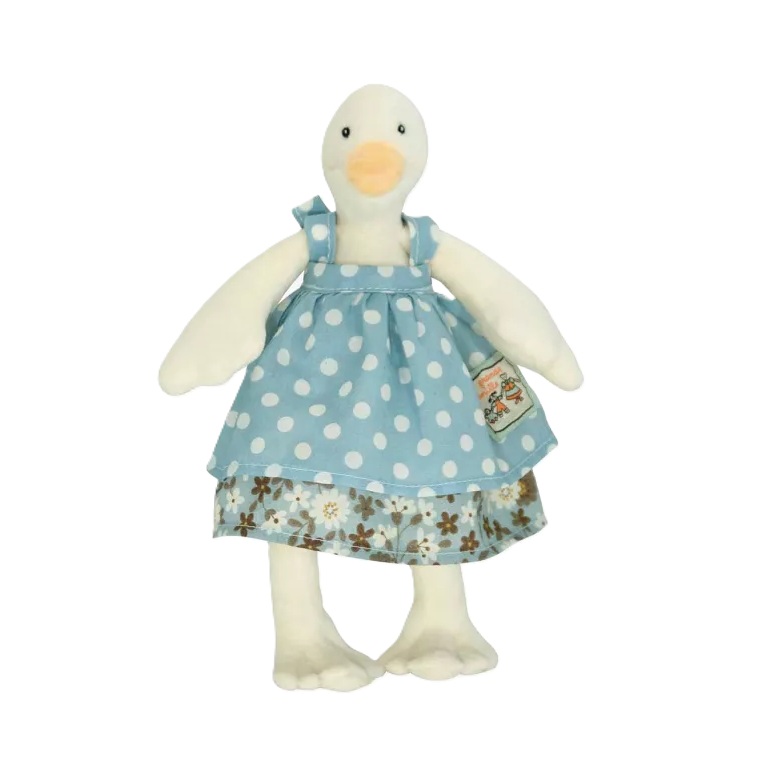 בובת ברווזה לבנה עם מקור צהוב ושמלה קיצית בצבע תכלת.
