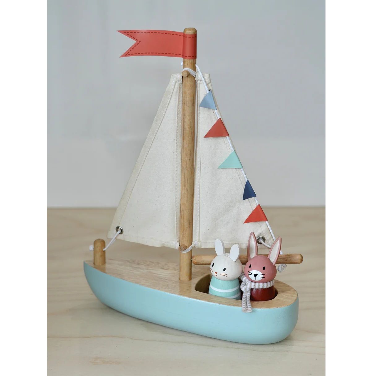 סירת מפרש מסורתית מעץ מלא, ובה שטים החברים הכי טובים, הדוב והארנב, ונהנים מהנוף.